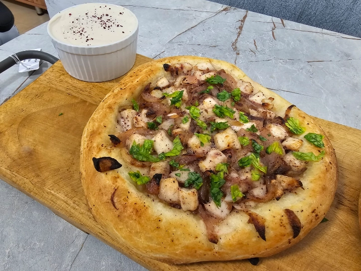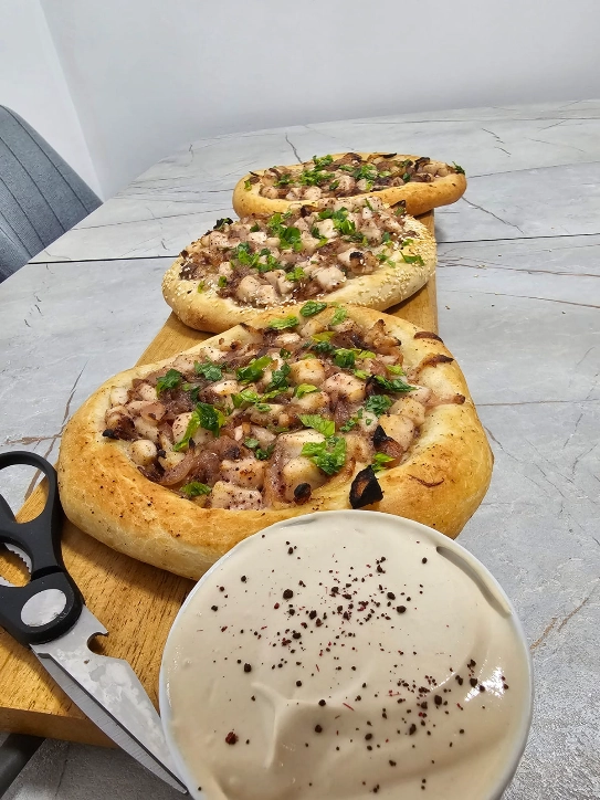 – מרימים את עיגול הבצק ממשטח העבודה, ומרחיבים אותו תוך מתיחה עדינה ובלי לפגוע בשוליים המוגבהים, עד שהוא מגיע לקוטר 20 ס"מ ונוצרת מעין פיתה עם שוליים.